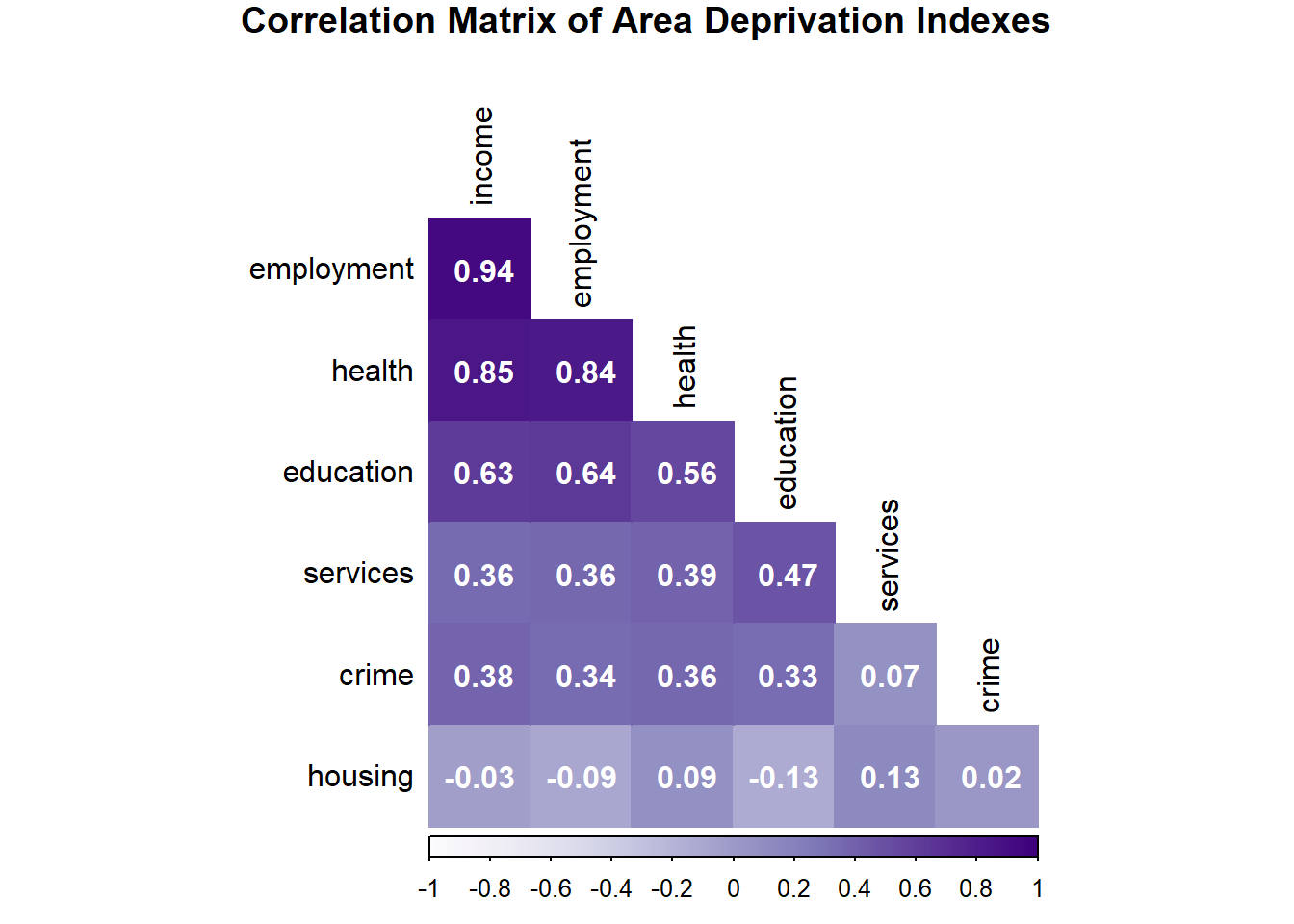 corrplot(cor(data[5:11]), method = 'color', order = 'FPC', type = "lower", diag = FALSE, col = COL1('Purples'), addCoef.col = 'white', title = "Correlation Matrix of Area Deprivation Indexes", mar=c(0,0,1,0), tl.col="black")