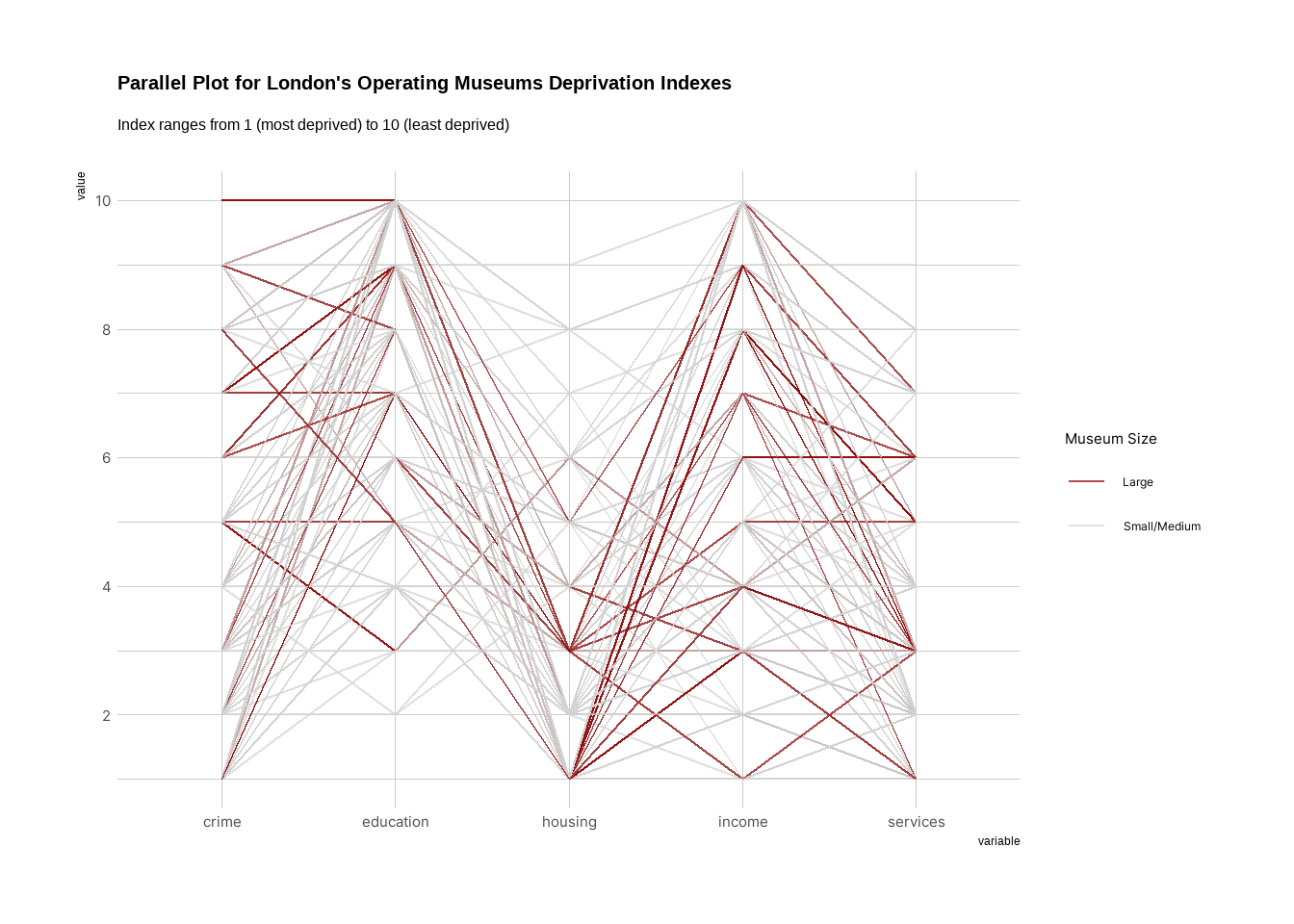 title = "Parallel Plot for London's Operating Museums Deprivation Indexes",