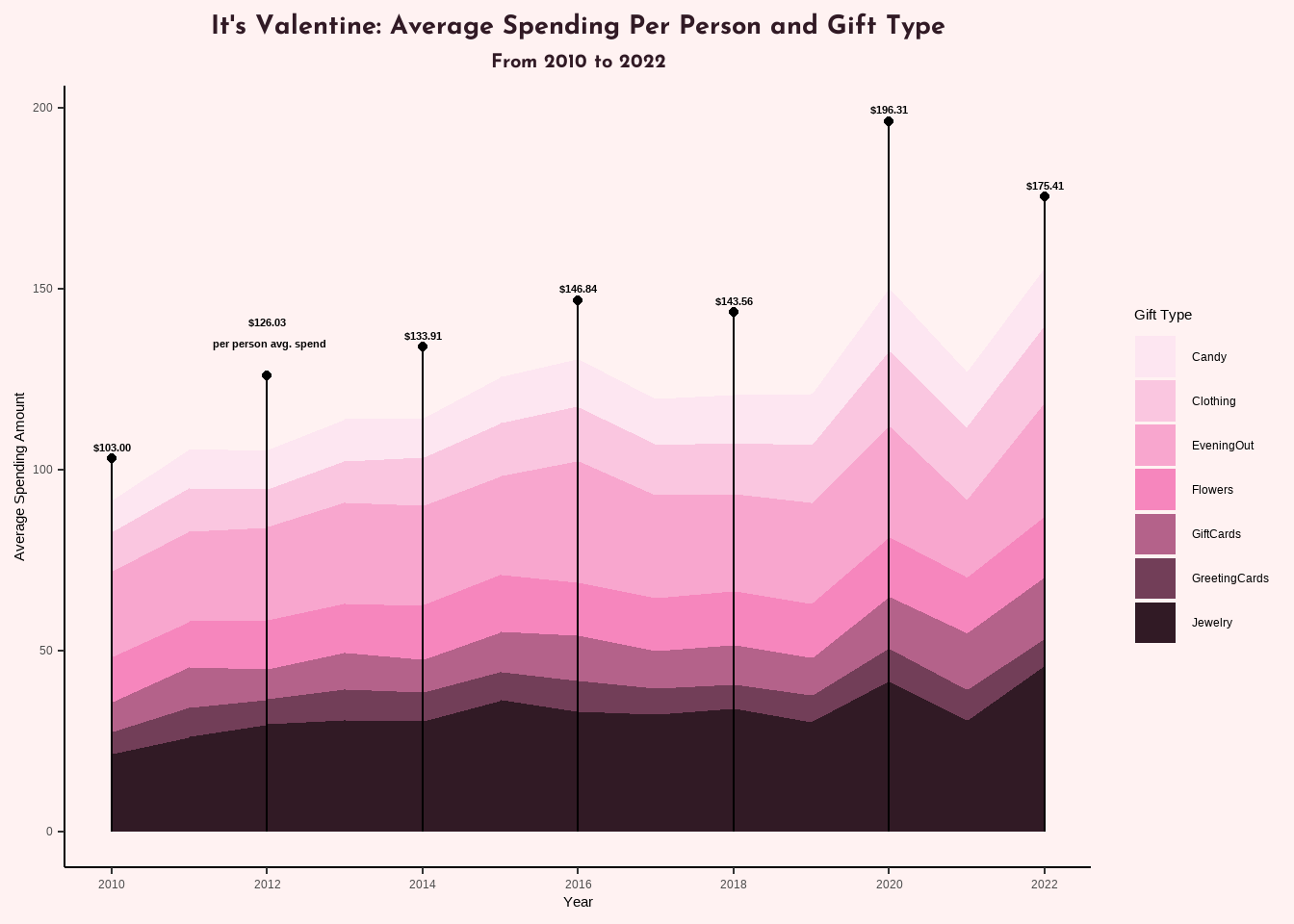 labs(title = "It's Valentine: Average Spending Per Person and Gift Type", subtitle = "From 2010 to 2022", y = "Average Spending Amount", fill = "Gift Type") +