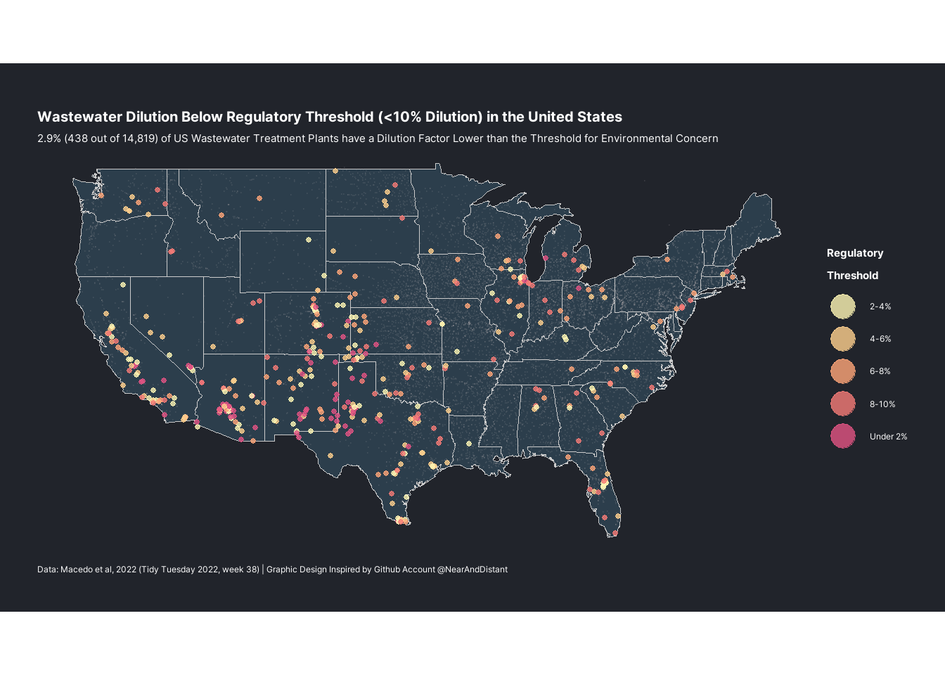 labs(title = "Wastewater Dilution Below Regulatory Threshold (<10% Dilution) in the United States", subtitle = "2.9% (438 out of 14,819) of US Wastewater Treatment Plants have a Dilution Factor Lower than the Threshold for Environmental Concern", color = str_wrap("Regulatory Threshold", 8), caption = "Data: Macedo et al, 2022 (Tidy Tuesday 2022, week 38) | Graphic Design Inspired by Github Account @NearAndDistant") +